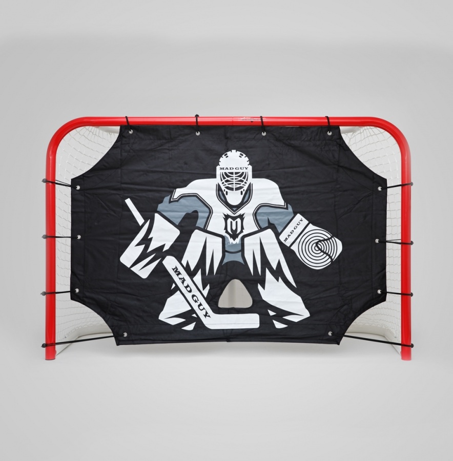 Хоккейный тренажер имитатор вратаря MAD GUY выполнен из синтетического материала высокой плотности. Данный тренажер предназначен для отработки статических и динамических ударов, а так же точности бросков. Имитатор надевается на хоккейные ворота и крепится при помощи лямок. Для исключения проскальзывания шайбы в нижней части имеется вшитая планка. На имитаторе изображен вратарь и расположены пять отверстий для попадания шайбой. Тренажер незаменим в тренировочном процессе. Преимущества имитации для хоккея перед живым игроком несравнимы, так как далеко не каждый вратарь способен сохранить высокую работоспособность и молниеносность реакции на протяжении всей тренировки.