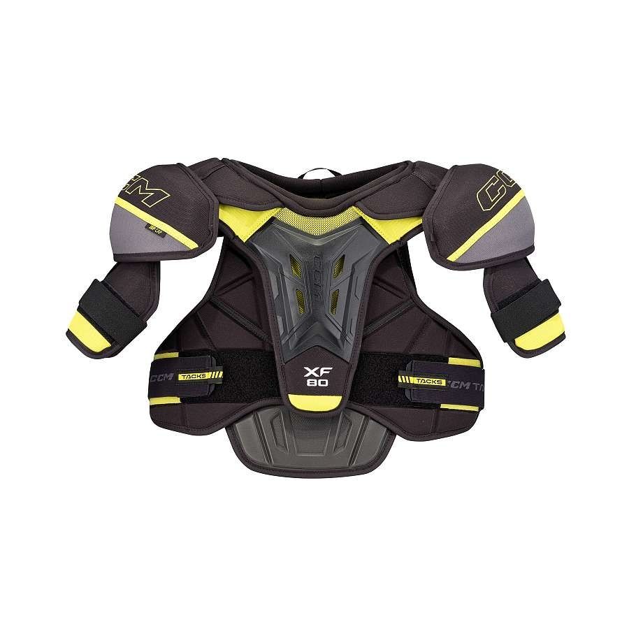 Нагрудник CCM TACKS XF 80 с двухслойной передней конструкцией из пенополиуретана и износостойкой сублимированной подкладкой, которые обеспечивают повышенную подвижность без ущерба защитным свойствам на любом соревновательном уровне. Изготовленные из легкого и надежного пластика накладки, в которых реализована зарекомендовавшая себя технология JDP, создают высокий уровень защиты плечевому суставу. В основе защиты в области торса используется прессованная панель с сублимированной подкладкой. В сочетании с плавающим нагрудником они придают необходимую подвижность и высокий уровень защиты для игрока.
